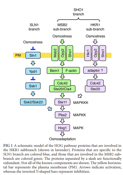 HKR1(Histidine kinase rhodopsin 1)即组氨酸激酶视紫红质,是一种受光调节的受体组氨酸激酶。它用质子化视网膜希夫碱 (RSB) 辅因子在紫外线吸收状态 (Rh-UV) 和蓝色吸收状态 (Rh-Bl) 之间切换,通过在 13-trans,15-anti 和 13-cis,15 混合物之间切换同分异构体实现。 除此之外,HKR1本身作为一种细胞膜表面受体,属于一种MAPKKK→MAPKK→MAPK通路的起始蛋白质,此处的MAPK是hog1蛋白,目前的研究已表明,HKR1激活hog1蛋白的途径是一种与Msb2激活hog1蛋白相对独立的途径。 |